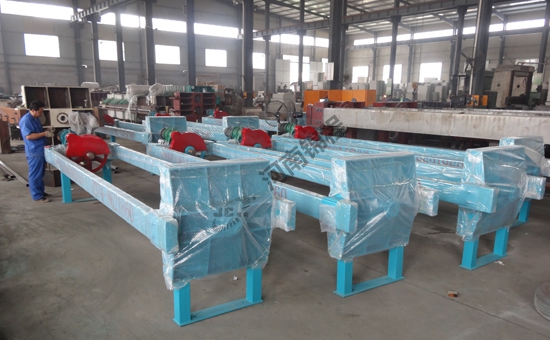機(jī)械壓緊壓濾機(jī)壓緊時(shí)有電動(dòng)機(jī)帶動(dòng)減速機(jī),經(jīng)傳動(dòng)部件推動(dòng)壓板壓緊濾板。壓緊螺桿和固定螺母設(shè)計(jì)有可靠的自鎖螺旋角,能保證壓緊時(shí)的可靠性和穩(wěn)定性。用電機(jī)綜合保護(hù)器實(shí)現(xiàn)自動(dòng)控制??蓪?duì)電機(jī)實(shí)現(xiàn)過(guò)熱和過(guò)載保護(hù)。