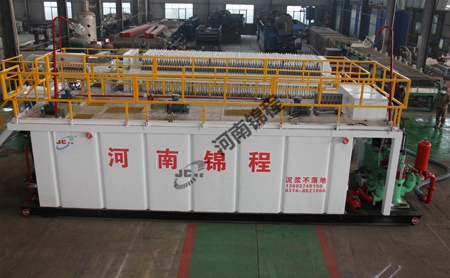 此工藝主要流程為:將鉆井過程中排放的廢棄泥漿通過泥漿收集箱,用泵提升送至巖屑緩存裝置,用泵提升至破乳混凝罐,用干粉投加機(jī)定量加破乳、助凝藥?;炷河商沾呻p缸泵抽至撬裝隔膜壓濾機(jī)進(jìn)行固液分離,分離出來的泥餅由皮帶輸送機(jī)輸送出壓濾單元,濾液進(jìn)入后續(xù)凈化處理裝置。